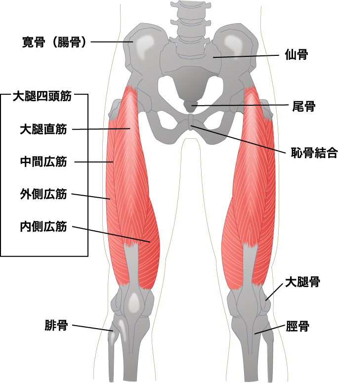 大腿四頭筋とは、大腿の前面にある筋の集合体で、大腿直筋・内側広筋・外側広筋・中間広筋から構成されている。