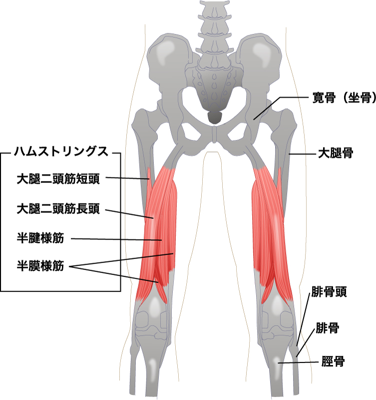 ハムストリングスは、大腿後面の大腿二頭筋・半腱様筋・半膜様筋の総称であり、下腿を曲げるのに役立っている。