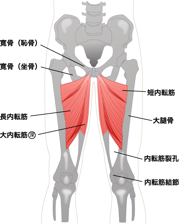 内転筋群とは、大腿を内転させる働きのある筋群で、大腿の内側にある。